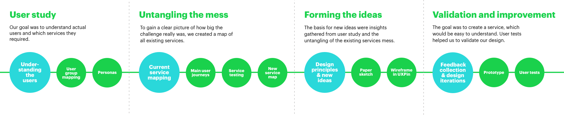 We quickly ran into the next challenge. The information architecture of the current services was incomprehensible. The navigation was full of links which directed users to a variety of different pages where they were met by more links. To gain clear picture of how big our challenge was, we created a comprehensive map of all existing environments.