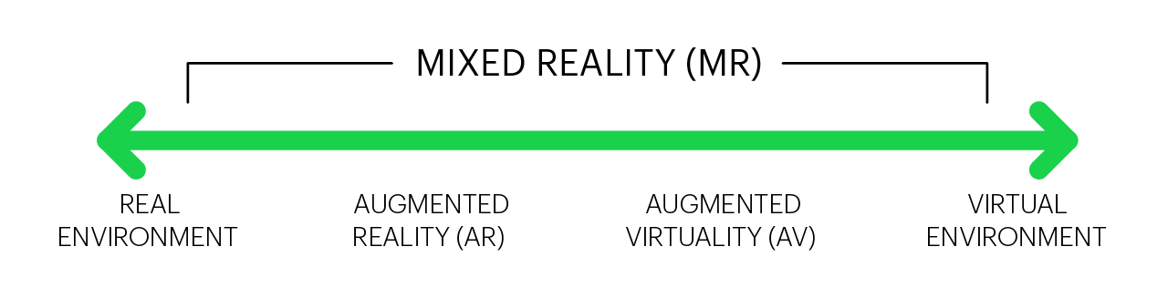 Mixed reality — This is a wide and flexible term, and is often referred to as a scale of virtuality and reality. Mixed reality is different from augmented reality in that it adds more than just layers of information, but also virtual objects in real space.