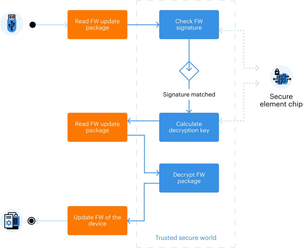 Data signing and encryption – A firmware update package is encrypted and signed by the device manufacturer, ensuring that only trusted update packages are processed.