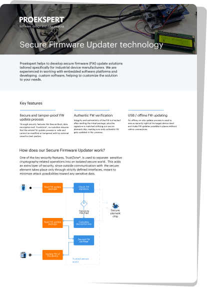 Proekspert helps to develop secure firmware (FW) update solutions tailored specifically for industrial device manufacturers. We are experienced in working with embedded software platforms and developing custom software, helping to customize the solution to your needs.