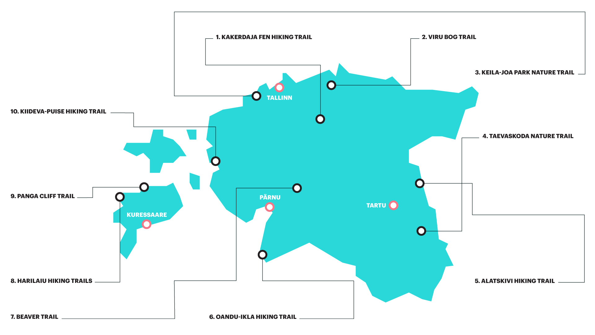 The RMK hiking trail is the first hiking trail to pass through all of Estonia. Covering 370 km, the trail starts in Northern Estonian at Oandu in Lahemaa National Park and leads through the thick Kõrvemaa forests and then onto the Soomaa National Park—one of the most magnificent marshlands in Europe.