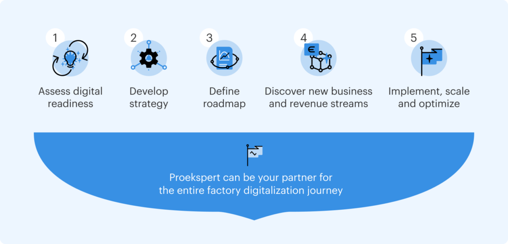 Factory digitalization should be in line with business strategy. To ensure processes deliver business value, clearly define expectations for change. By defining needs, you will be able to earlier identify and prioritize potential barriers.