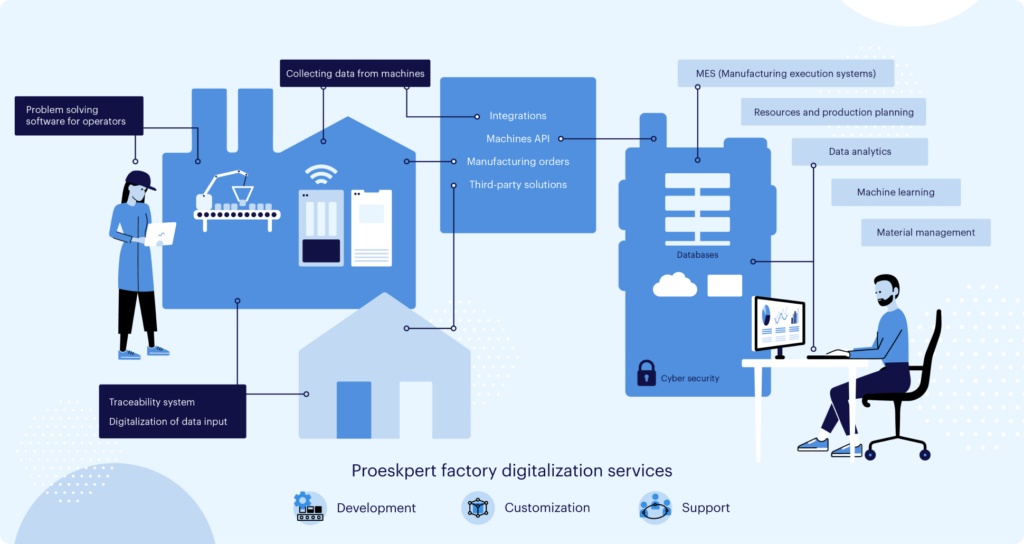 Factory digitalization doesn’t always require substantial investment in sophisticated machinery – it may be possible to digitally connect existing manufacturing equipment. Connection provides data that can be used to correctly estimate faults, avoiding human error when assessing factory hardware.