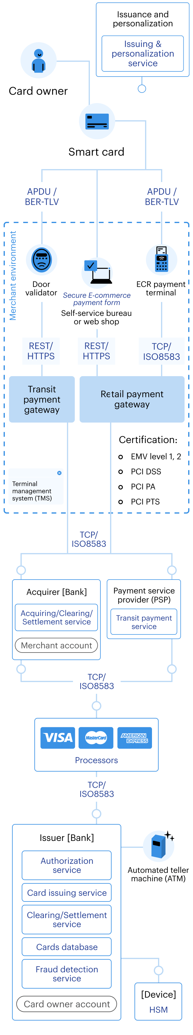 Our projects usually are customized according to the customer’s business needs and existing ecosystem, while following strict industry standards (e.g., those of Visa, Mastercard, etc.).