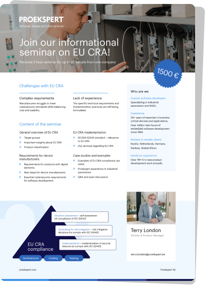 Proekspert offers comprehensive solutions for EU CRA compliance, guiding manufacturers through cybersecurity assessments, practical recommendations, and feature implementation.